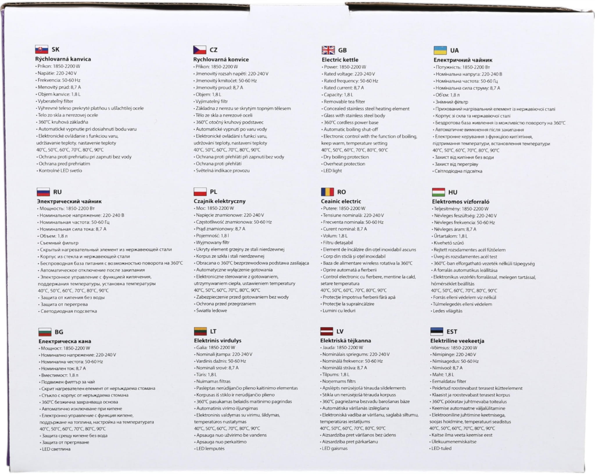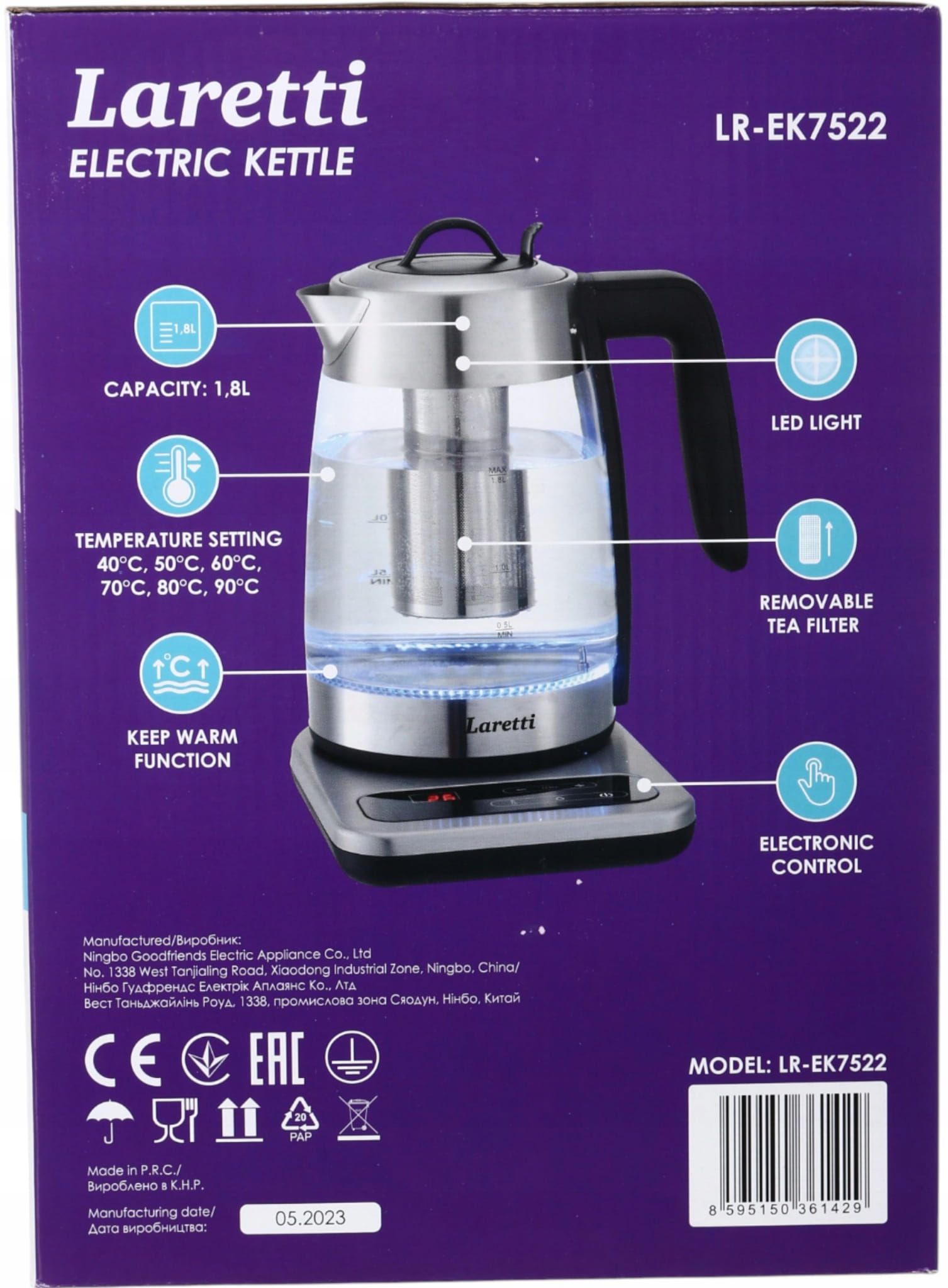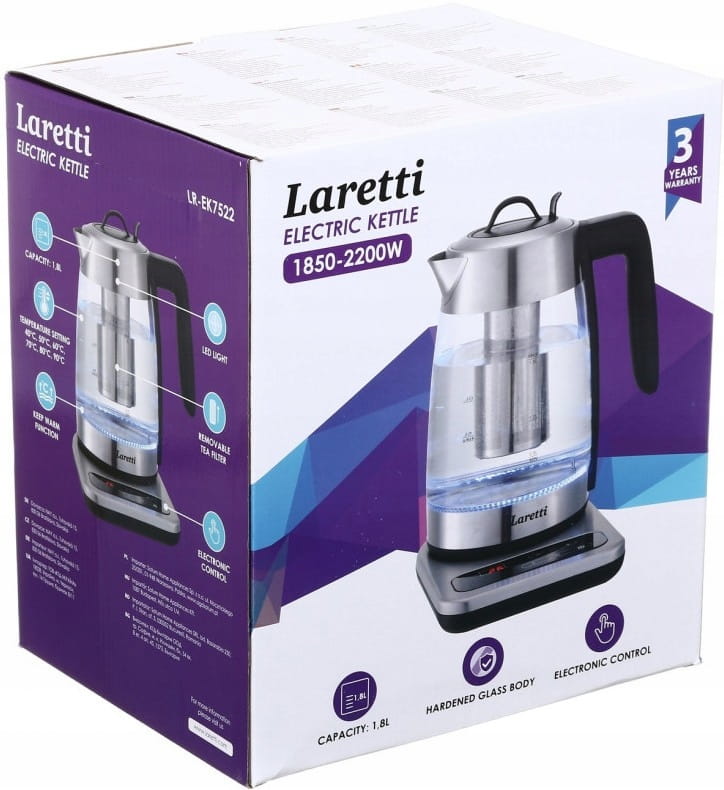 Czajnik elektryczny LARETTI LR-EK7522 to wielofunkcyjne urzadzenie, które podgrzewa wodę do celów domowych. Pojemność tego modelu wynosi 1,8 litra. Dzięki mocy 2200 W nagrzewanie jest dość szybkie. Korpus jest w większości wykonany z hartowanego szkła, dzięki czemu można zobaczyć wszystko, co dzieje się z wrzącą wodą. Poszczególne części wykonane są z odpornej na zużycie stali.