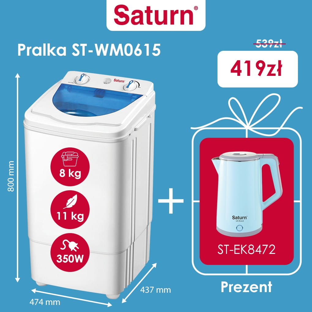 Saturn ST-WM0615 łączy prostotę obsługi z funkcjonalnością. Pozwala szybko wyprać ubrania bez konieczności uruchamiania dużej, zaawansowanej pralki. Minimalna ilość trybów to mniej awarii i niższe koszty eksploatacji.