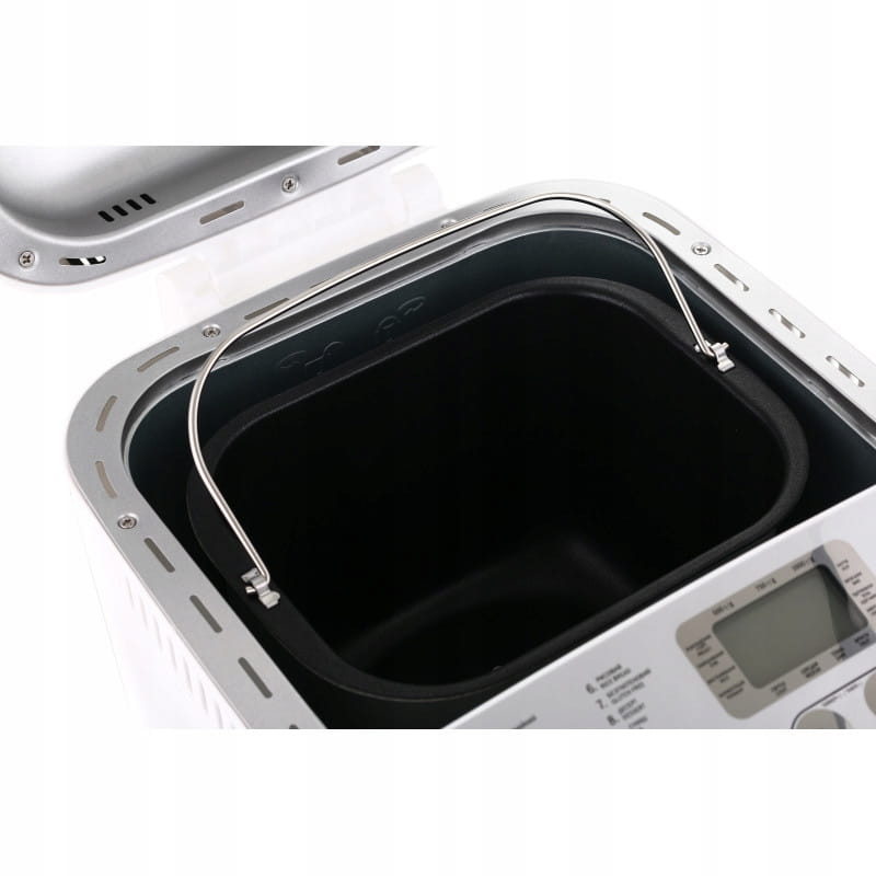Wypiekacz posiada wygodne okienko do obserwacji procesu pieczenia, czytelny panel sterowania i obudowę z wytrzymałego tworzywa. W zestawie znajduje się miarka i łyżka do odmierzania składników.